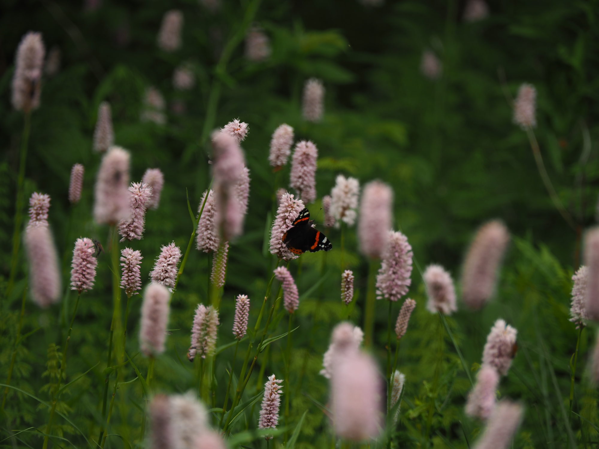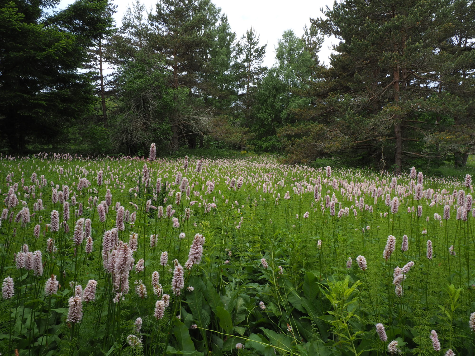 Les végétaux adaptés à ce milieu ont donc développé des stratégies comme celles de la Droséra, qui “scotchent” les moucherons de passage pour “complémenter leur alimentation” et une jolie prairie de Renouée de Bistorte.